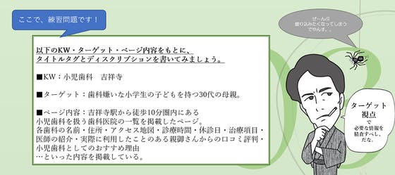 【画像の練習問題の解答 & サクサク見出しが創れる七つの型を伝授!】歯医者嫌いなお子さんを持つママのために、吉祥寺の小児歯科についてまとめたサイト。あなたなら、どんなタイトルタグ(検索結果画面に出てくるサイト名代わりの文言)を付けますか?「いつも同じような見出しになっちゃう」「コピーってセンス...