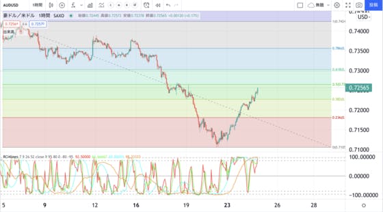 すみません、本日、仕事が終わったのが先程、ようやく久しぶりにチャートがみれました。かなり近い位置ですが、指値注文を出します。オジドル1時間足にて、RCI26がダイバージェンス気味です。安値から、150pipsも上昇していることから調整が入る前提でショートに入ります。オーストラリアのファンダメン...