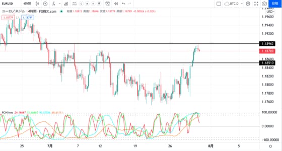 すみません、少し配信が遅くなりました。。。ユーロドルがレジスタンスラインに到達して、一旦戻されているので、半分だけ手仕舞いをしようと思います。手仕舞い期間は16時までの欧州勢が入ってくる前までです。(できたら欧州始まる前までに)次の押し目買いは1.1845-52付近何本が引けるサポートライン...