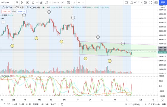 見事に先手をうたれました(泣笑)ビットコインですが、強烈な反発です。直近安値から10%も上昇です。サイクル理論としては読んでいたのですが、これほどいきなり急騰するとは思いませんでした。全く仕込めてません(笑)これはあまりにも悔しいので、ちょっと、もう少ししばらく様子見をしようと思います。さすが...