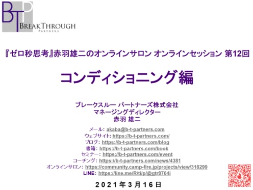 今回は、「コンディショニング」というテーマでお話ししました。コンディショニングの鍵は、体調管理とメンタル管理です。私は幸い、ほぼ常にベストコンディションを維持できていますので、そのポイントをお伝えしました。今回の内容は、1. コンディショニングの基本的考え方2. ベストコンディションを維持する...