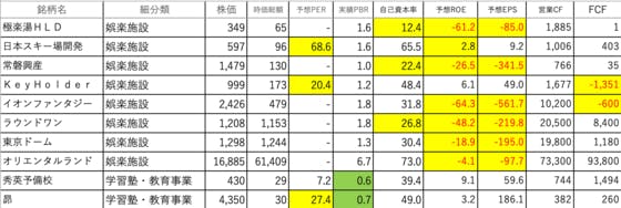 サービス業28です。極楽湯HLD:自己資本率が低く、ROE、EPSがマイナス日本スキー場開発:PERが高く、ROEが低い常磐興産:自己資本率が低く、ROE、EPSがマイナスKeyHolder:PERがやや高く、FCFがマイナスイオンファンタジー:ROE、EPS、FCFがマイナスラウンドワン:自...