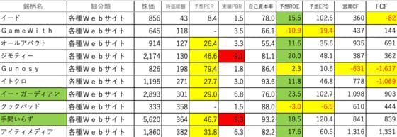 サービス業26です。イード:ROEがやや高く、FCFがマイナスGameWith:ROE、EPSがマイナスオールアバウト:PERとROEがやや高いジモティー:PERが高く、PBRが異常に高く、ROEがやや高いGunosy:PERが高く、ROEが低く、営業CFとFCFがマイナスイトクロ:PERとR...