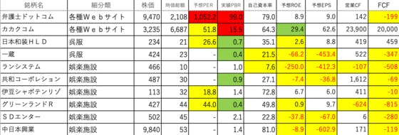 サービス業27です。弁護士ドットコム:PERとPBRが異常に高く、FCFがマイナスカカクコム:PERとROEが高く、PBRが異常に高い日本和装HLD:PERがやや高く、ROEが低い一蔵:自己資本率が低く、ROE、EPS、FCFがマイナスランシステム:自己資本率が低く、ROE、EPS、営業CFと...