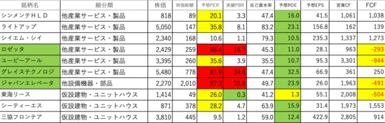 サービス業22です。シンメンテHLD:PERとROEがやや高いライトアップ:PERとROEがやや高いシイエム・シイ:ROEがやや高いですロゼッタ:PER、PBRが異常に高く、ROEがやや高く、FCFがマイナスユーピーアール:PERとROEがやや高く、FCFがマイナスグレイステクノロジ:PERと...