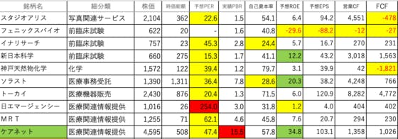 サービス業24です。スタジオアリス:PERがやや高く、FCFがマイナスフェニックスバイオ:ROE、EPS、営業CFとFCFがマイナスイナリサーチ:PERが高く、自己資本率が低い新日本科学:PERとROEがやや高い神戸天然物化学:PERが高く、FCFがマイナスソラスト:PERが高く、自己資本率が...