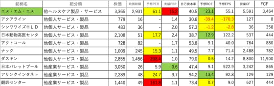 サービス業21です。エス・エム・エス:PERが高く、PBRが異常に高く、ROEがやや高いアクアライン:ROE、EPSマイナスシンワワイズHLD:ROE、EPSマイナス日本動物高医センタ:PERとROEがやや高いアクトコール:可もなく不可もなくですナック:PERがやや高いですダスキン:PERが異...