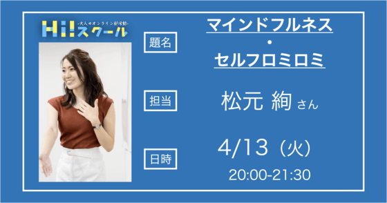 コミュニティメンバーの皆様、こんばんは!最近は4月にも関わらず、寒い日が続いておりますが、いかがお過ごしですか?今回は4/13( 火) 20:00-21:30 (60〜90分間)の講座のご連絡です!教授は松元絢さんです。以下は今回のテーマ・概要および松元さんのプロフィールです![テーマ]マイン...