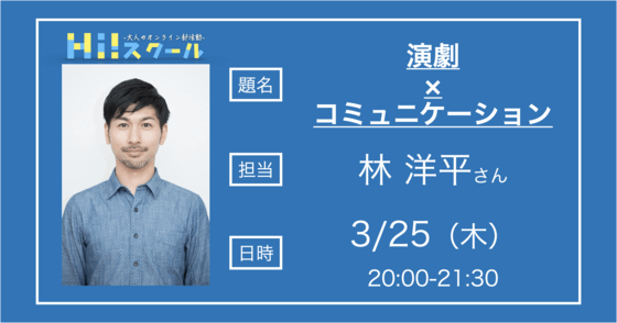 コミュニティメンバーの皆様、こんばんは!出会いと別れのシーズン、いかがお過ごしでしょうか?さて、今回は元俳優の方の講座についてご連絡させていただきます!講師は林洋平さんです!以下詳細です!【日時】3/25(木) 20:00-21:30【テーマ】演劇×コミュニケーション【講座概要】演劇メソッドを...