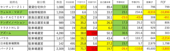 不動産業14です。センチュリー21J:PERとROEがやや高いウェルス・マネジ:ROEがやや高く、営業CFとFCFがマイナスG-FACTORY:PERがやや高く、ROE、EPS、FCFがマイナステンポイノベション:PERとROEがやや高く、自己資本率が低いトラストHLD:PERとROEがやや高...