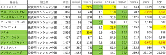 不動産業12です。LeTech:PERがやや高く、自己資本率が低いグローバルリンクM:自己資本率が低く、ROEがやや高く、営業CFとFCFがマイナスフェイスネットワク:ROEがやや高いですアーバネットコーポ:可もなく不可もなくですプロパティA:自己資本率が低く、ROEがやや高く、FCFがマイナ...