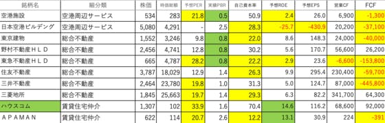 不動産業13です。空港施設:PERがやや高く、ROEが低く、FCFがマイナス日本空港ビルデング:自己資本率が低く、ROE、EPS、FCFがマイナス東京建物:自己資本率が低く、FCFがマイナス野村不動産HLD:可もなく不可もなくです東急不動産HLD:PERがやや高く、自己資本率が低く、ROEが低...