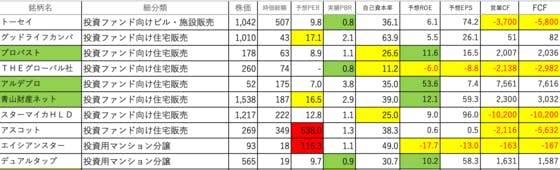 不動産業11です。トーセイ:営業CFとFCFがマイナスグッドライフカンパ:PERがやや高いですプロパスト:自己資本率が低く、ROEがやや高いTHEグローバル社:自己資本率が低く、ROE、EPS、営業CFとFCFがマイナスアルデプロ:ROEが高いです青山財産ネット:PERがやや高く、ROEがやや...