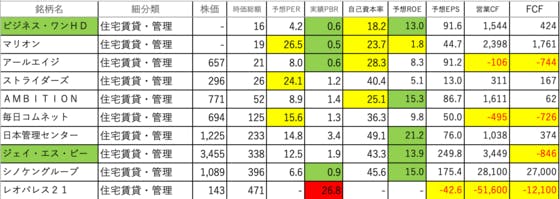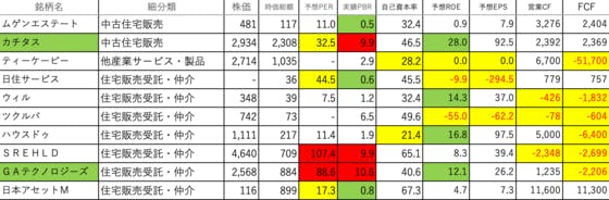 不動産業7です。ムゲンエステート:可もなく不可もなくですカチタス:PERがやや高く、PBRが異常に高く、ROEがやや高いティーケーピー:自己資本率が低く、ROE、EPSが0で、FCFがマイナス日住サービス:PERが高く、ROE、EPSがマイナスウィル:ROEがやや高く、営業CFとFCFがマイナ...