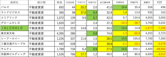不動産業5です。パルマ:PERとROEがやや高いランドビジネス:PERが高く、ROEが低いエリアリンク:可もなく不可もなくですグロームHLD:ROE、EPSがマイナスJALCOHLD:ROEがやや高く、営業CFとFCFがマイナス東京楽天地:ROE、EPSがマイナスシーアールイー:自己資本率が低...