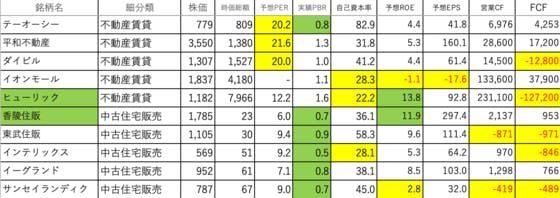 不動産業6です。テーオーシー:PERがやや高いです平和不動産:PERがやや高いですダイビル:PERがやや高く、FCFがマイナスイオンモール:自己資本率が低く、ROE、EPSがマイナスヒューリック:自己資本率が低く、ROEがやや高く、FCFがマイナス香陵住販:ROEがやや高いです東武住販:営業C...