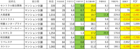 不動産業2です。セントラル総合開発:自己資本率が低く、営業CFとFCFがマイナスサンウッド:自己資本率が低く、FCFがマイナス大英産業:自己資本率が低く、ROEがやや高く、営業CFとFCFがマイナスエストラスト:自己資本率が低く、営業CFとFCFがマイナス明豊エンタープライ:可もなく不可もなく...