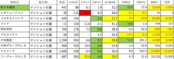 不動産業3です。レボリューション:PERが異常に高く、ROE、EPSがマイナスコスモスイニシア:自己資本率が低く、ROE、EPS、営業CFとFCFがマイナスランド:ROEがやや高いです明和地所:営業CFとFCFがマイナスプロスペクト:ROE、EPS、営業CFとFCFがマイナス穴吹興産:自己資本...
