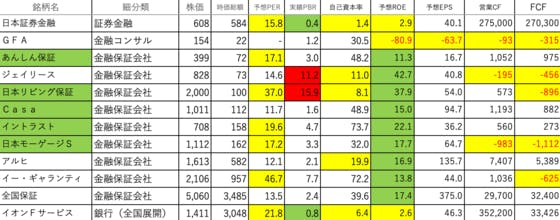 その他金融業3です。日本証券金融:PERがやや高く、自己資本率が低く、ROEが低いGFA:ROE、EPS、営業CFとFCFがマイナスあんしん保証:PERとROEがやや高いジェイリース:PBRが異常に高く、自己資本率が低く、ROEが高く、営業CFとFCFがマイナス日本リビング保証:PERが高く、...