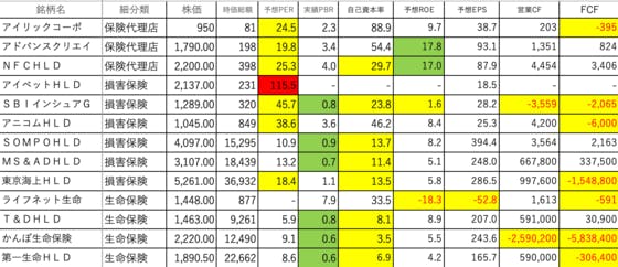 保険業です。アイリックコーポ:PERがやや高く、FCFがマイナスアドバンスクリエイ:PERとROEがやや高いNFCHLD:PERとROEがやや高く、自己資本率が低いアイペットHLD:PERが異常に高いですSBIインシュアG:PERが高く、自己資本率が低く、ROEが低く、営業CFとFCFがマイナ...