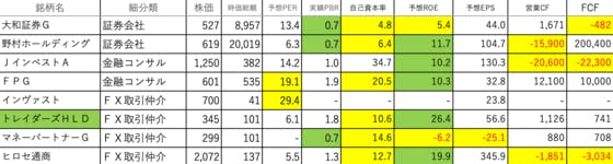 証券・商品先物取引業4です。大和証券G:自己資本率、ROEが低く、FCFがマイナス野村ホールディング:自己資本率が低く、ROEがやや高く、営業CFがマイナスJインベストA:ROEがやや高く、営業CFとFCFがマイナスFPG:PERがやや高く、自己資本率が低く、ROEがやや高いインヴァスト:PE...