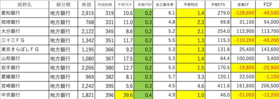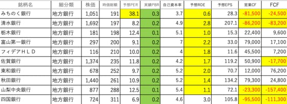 銀行業3です。みちのく銀行:PERが高く、ROEが低く、営業CFとFCFがマイナス清水銀行:ROEが低く、営業CFとFCFがマイナス栃木銀行:ROEが低い富山第一銀行:ROEが低いフィデアHLD:ROEが低い佐賀銀行:ROEが低く、FCFがマイナス東和銀行:ROEが低い秋田銀行:ROEが低い山...