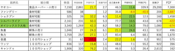 小売業35です。ヤオコー:PERとROEがやや高いファンデリー:ROE、EPS、FCFがマイナスショクブン:PERとROEがやや高く、自己資本率が低いシルバーライフ:PERが高く、ROEがやや高く、FCFがマイナスオイシックスラ大地:PERが高く、ROEがやや高く、FCFがマイナス魚喜:PER...