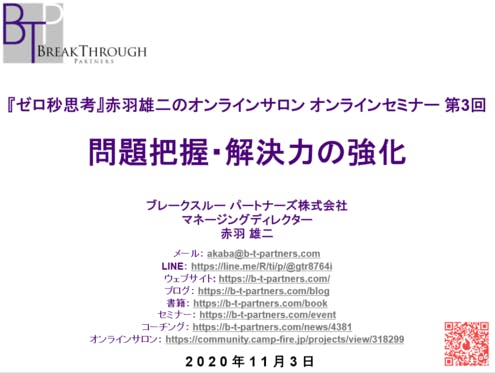 今回は、「問題把握・解決力の強化」というテーマでお話ししました。問題把握・解決力はA4メモ書きを続けることで急速に身についていきます。特に大事で、応用範囲の広い「多面的な書き方」についてしっかりとご説明しました。1. A4メモを多面的に書く、深掘りして書く2. 将来を自分の手でつかむための問題...