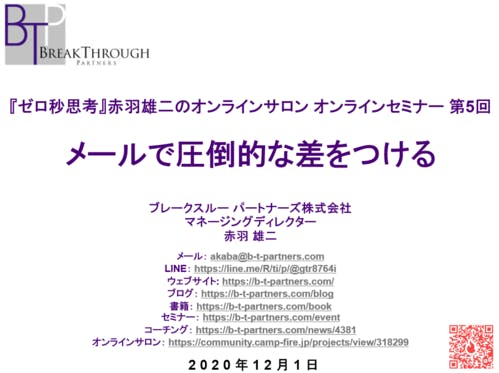 今回は、「メールで圧倒的な差をつける」というテーマについて詳しくご説明し、皆さんの悩みにお答えしました。メールをうまく活用される方は仕事もプライベートもスムーズに進めることができます。LINE、Facebookメッセンジャーなども使われていますが、ビジネス上、メールの重要性はますます高まってい...