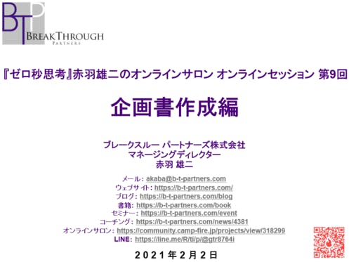 今回は、「企画書作成」というテーマでお話ししました。企画書作成への苦手意識がなくなれば、ほとんどの方にとって人生が明るくなると思います。私も最初は大変に苦手でしたが、あれこれ苦労し、試行錯誤する中でこうすればいい、というアプローチにたどりつきました。それが「アウトプットイメージ作成アプローチ」...