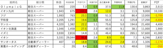 小売業27です。OlympicG:ROEがやや高いですイオン九州:PERが異常に高く、自己資本率が低いフジ:PERがやや高く、FCFがマイナス平和堂:PERがやや高く、FCFがマイナスサンエー:PERがやや高いですイオン北海道:PERがやや高いですイズミ:可もなく不可もなくですイオン:PERが...