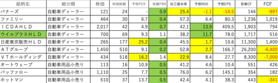 小売業28です。バナーズ:自己資本率が低く、ROE、EPS、FCFがマイナスファミリー:可もなく不可もなくですICDAHLD:ROEがやや高いですウイルプラスHLD:ROEがやや高いです日産東京販売HLD:PERがやや高く、ROEが低いATグループ:ROEが低く、FCFがマイナスVTホールディ...