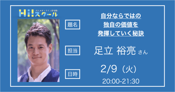 [!!!初月無料キャンペーン中!!!]皆様、おはようございます!日曜日の朝いかがお過ごしでしょうか?今回は2/9 20:00-21:30の講座についてお伝えします!講師は足立裕亮さんです!以下にテーマ・講座概要・経歴を載せていますのでご確認ください![テーマ]自分ならではの独自の価値を発揮して...