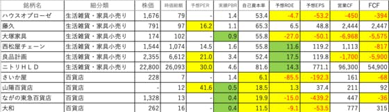 小売業24です。ハウスオブローゼ:ROE、EPS、営業CFとFCFがマイナス藤久:PERがやや高いです大塚家具:ROE、EPS、営業CFとFCFがマイナス西松屋チェーン:ROEがやや高く、FCFがマイナス良品計画:PERとROEがやや高く、営業CFとFCFがマイナスニトリHLD:PERとROE...
