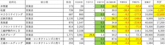小売業25です。井筒屋:自己資本率が低く、ROE、EPS、FCFがマイナス松屋:ROE、EPS、FCFがマイナスH2Oリテイリング:ROE、EPS、FCFがマイナス近鉄百貨店:自己資本率が低く、ROE、EPSがマイナス高島屋:ROE、EPSがマイナスJフロントリテイリ:自己資本率が低く、ROE...