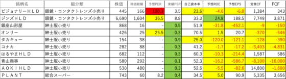 小売業26です。ビジョナリーHLD:PERが異常に高く、自己資本率が低く、ROE、EPSがマイナスジンズHLD:PERが高く、ROEがやや高い銀座山形屋:ROE、EPS、営業CFとFCFがマイナスオンリー:PERがやや高く、ROEが低く、営業CFとFCFがマイナスタカキュー:自己資本率が低く、...