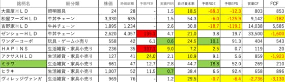 小売業23です。大黒屋HLD:自己資本率が低く、ROE、EPSがマイナス松屋フーズHLD:ROE、EPS、FCFがマイナス吉野家HLD:ROE、EPSがマイナスゼンショーHLD:PERが異常に高く、自己資本率が低く、FCFがマイナスワンダーコーポ:自己資本率が低く、ROEがやや高いHAPiNS...
