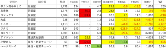 小売業21です。串カツ田中HLD:自己資本率が低く、ROE、EPSがマイナス鳥貴族:PERが異常に高く、自己資本率が低く、営業CFとFCFがマイナスヨシックス:PERが異常に高く、ROEが低く、FCFがマイナス大庄:ROE、EPS、営業CFとFCFがマイナスチムニー:ROE、EPS、営業CFと...