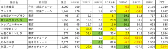 小売業22です。カネ美食品:ROE、EPSがマイナスプレナス:ROE、EPSがマイナス文教堂グループHD:自己資本率が低く、ROEが高いです富士山マガジンS:自己資本率が低く、ROEがやや高いトップカルチャー:自己資本率が低く、ROEがやや高い三洋堂HLD:PERが高く、自己資本率が低い丸善C...