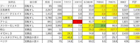 小売業18です。ジー・テイスト:ROE、EPS、FCFがマイナス元気寿司:ROE、EPSがマイナスカッパ・クリエイト:ROE、EPSがマイナスくら寿司:PERが高いですアトム:PBRが異常に高く、ROE、EPSがマイナススシローGLHD:PERが高く、自己資本率が低く、ROEがやや高い和心:自...