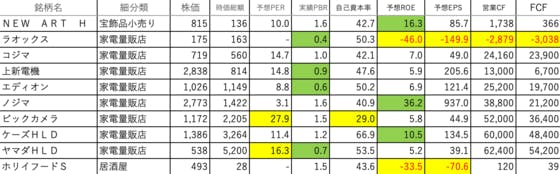 小売業19です。NEW ART H:ROEがやや高いですラオックス:ROE、EPS、営業CFとFCFがマイナスコジマ:可もなく不可もなくです上新電機:可もなく不可もなくですエディオン:可もなく不可もなくですノジマ:ROEが高いですビックカメラ:PERがやや高く、自己資本率が低いケーズHLD:R...