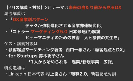 【2月の講義・対談】2月テーマは未来の当たり前から見るDX尾原講義は・「DX産業別パターン テックが強制進化させる産業非連続変化」・「コトラー マーケティング5.0 日本最速(?)解説 ヒューマニティのための技術 人と機械の共生を」ゲスト講義対談は・顧客起点マーケティング著者 ...