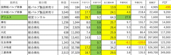 卸売業22です。国際紙パルプ商事:自己資本率が低く、ROEが低く、FCFがマイナス日本紙パルプ商事:PERがやや高く、ROEが低く、自己資本率が低いグリムス:PERとROEがやや高い兼松:自己資本率が低い双日:自己資本率が低い丸紅:自己資本率が低い豊田通商:自己資本率が低い住友商事:ROEとE...