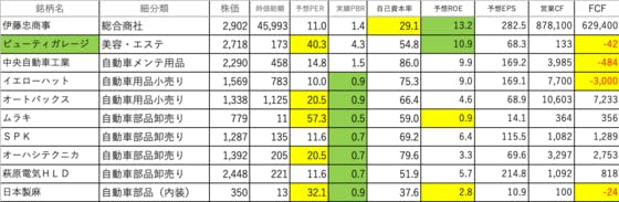 卸売業23です。伊藤忠商事:自己資本率が低く、ROEがやや高いビューティガレージ:PERが高く、ROEがやや高く、FCFがマイナス中央自動車工業:FCFがマイナスですイエローハット:FCFがマイナスですオートバックス:PERがやや高いですムラキ:PERが高く、ROEが低いSPK:可もなく不可も...