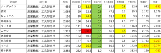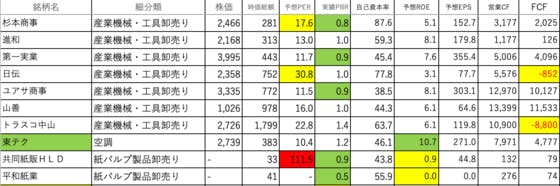 卸売業20です。ナ・デックス:PERが高く、ROEが低く、FCFがマイナス英和:可もなく不可もなくですNaITO:PERが高く、ROEが低い鳥羽洋行:可もなく不可もなくですリックス:可もなく不可もなくですムサシ:PERが異常に高く、ROEが低い西華産業:可もなく不可もなくです東京産業:FCFが...
