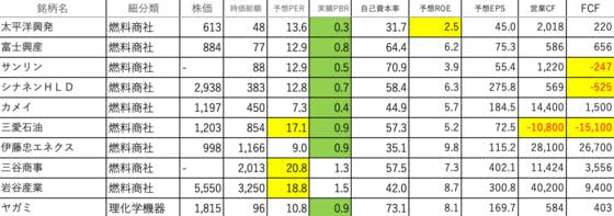 卸売業18です。太平洋興発:ROEが低いです富士興産:可もなく不可もなくですサンリン:FCFがマイナスシナネンHLD:FCFがマイナスカメイ:可もなく不可もなくです三愛石油:PERがやや高く、営業CFとFCFがマイナス伊藤忠エネクス:可もなく不可もなくです三谷商事:PERがやや高いです岩谷産業...