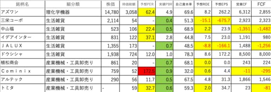 卸売業19です。アズワン:PERが高いです三栄コーポ:ROE、EPSがマイナス中山福:PERがやや高く、ROEが低く、営業CFとFCFがマイナスイデアインター:PERが高いですJALUX:ROE、EPS、FCFがマイナスドウシシャ:可もなく不可もなくです植松商会:ROEが0ですCominix:...