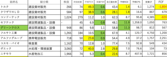 卸売業15です。トルク:PERが高く、ROEが低く、FCFがマイナスクワザワHLD:PERが高く、自己資本率が低く、ROEが低いコンドーテック:FCFがマイナスセフテック:ROEがやや高いですグリーンクロス:ROEがやや高いですフルサト工業:可もなく不可もなくですアルファグループ:PERがやや...