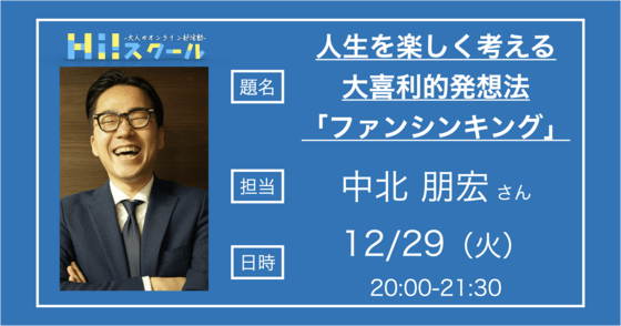 メリークリスマス!メンバーの皆様、こんにちは!本日は年内最後の講座のご案内をしたいと思います!講師は中北朋宏さんです。[テーマ]人生を楽しく考える大喜利的発想法「ファンシンキング」[講座概要]新しいアイディアを発想する際にも非常に有効な”大喜利”を活用し、楽しく生きるための思考法を学びます![...