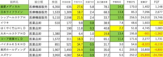 卸売業11です。歯愛メディカル:PERとROEがやや高い日本ライフライン:PERとROEがやや高いシップヘルスケアH:PERとROEがやや高いイワキ:FCFがマイナスほくやく竹山HLD:ROEが低いです大木ヘルスケアHD:自己資本率が低く、ROEがやや高く、営業CFとFCFがマイナスコーア商事...